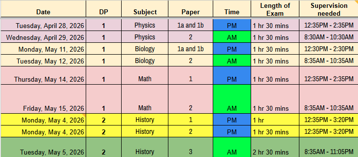 Exam schedule - Below is the exam schedule for DP1 and DP2 students. As mentioned previously, these exam dates are determined by IB and we are not able to accommodate requests to reschedule exams to a different date or time. We kindly ask that families make every effort to ensure students are available on their scheduled exam dates. Please note that missing an IB exam may impact a student’s ability to earn the IB Diploma, which they have worked very hard toward.