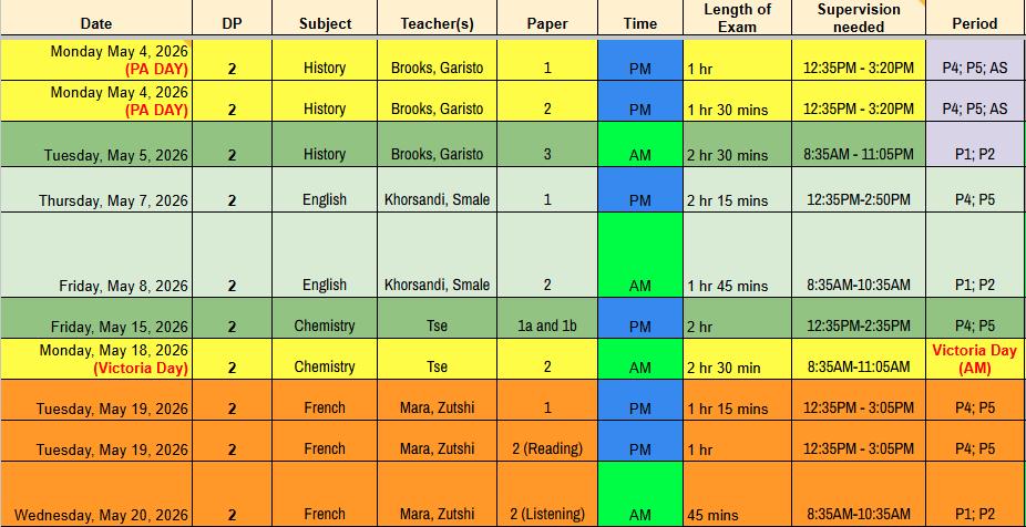 Note 1: Students will be writing exams on May 4 (PA Day) and May 18 (Victoria Day). More information regarding the logistics for these two days will be shared soon.